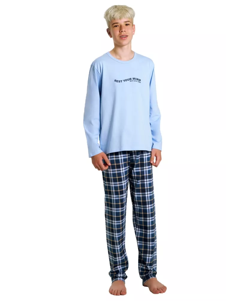 Chlapecké pyžamo Kris 3508 značky TARO představuje ideální volbu pro mladé muže, kteří ocení spojení pohodlí a stylu. Horní díl v jemné světle modré barvě je vyroben z mimořádně měkkého materiálu a zdobí jej nápis „REST YOUR MIND“ ve výrazném kontrastním provedení. Kulatý výstřih podtrhuje jednoduchou eleganci a zajišťuje maximální komfort při nošení. Spodní část tvoří volné kalhoty s klasickým kostkovaným vzorem v odstínech tmavě modré, zelené a bílé, které přinášejí osvědčený vzhled i příjemný pocit lehkosti během spánku nebo odpočinku.