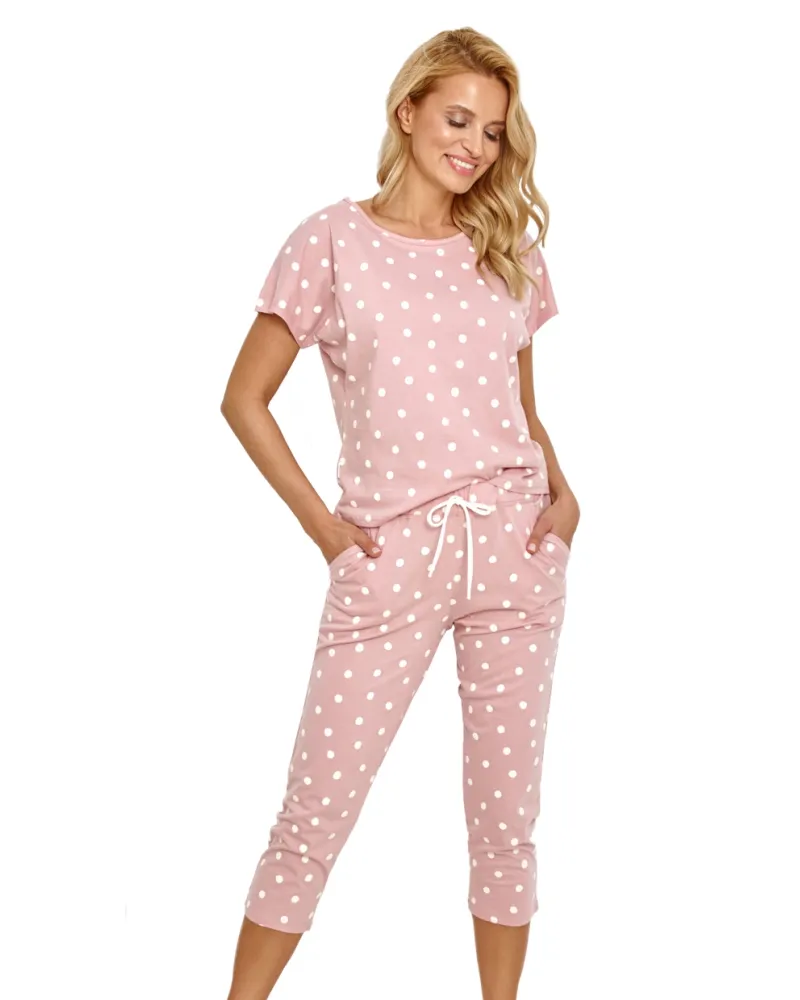 Dámské pyžamo Chloe 2860 značky TARO představuje spojení pohodlí a stylu, které ocení každá žena. Horní díl s kulatým výstřihem a krátkými rukávy nabízí volný střih pro maximální komfort během spánku i odpočinku. Puntíkovaný vzor na jemně růžovém podkladu dodává celému setu svěží ženský nádech. Spodní část tvoří praktické capri kalhoty, vybavené elastickým pasem se stahovací šňůrkou a postranními kapsami – ideální pro chvíle pohody doma nebo klidné noci.
