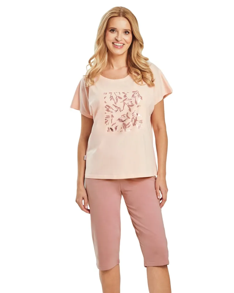 Dámské pyžamo Valentine 3523 značky TARO představuje dokonalou kombinaci elegance a pohodlí, kterou si zamilujete během každého večera. Horní díl s volnějším střihem a krátkými rukávy vytváří vzdušný pocit lehkosti, zatímco jemná pastelově růžová barva působí příjemně a uklidňujícím dojmem. Přední část zdobí decentní květinový motiv v tmavším odstínu růžové, který podtrhuje ženskost celého modelu. Spodní díl tvoří pohodlné capri kalhoty ve stejném tónu – ideální délka i střih umožňují volnost pohybu při relaxaci nebo spánku.