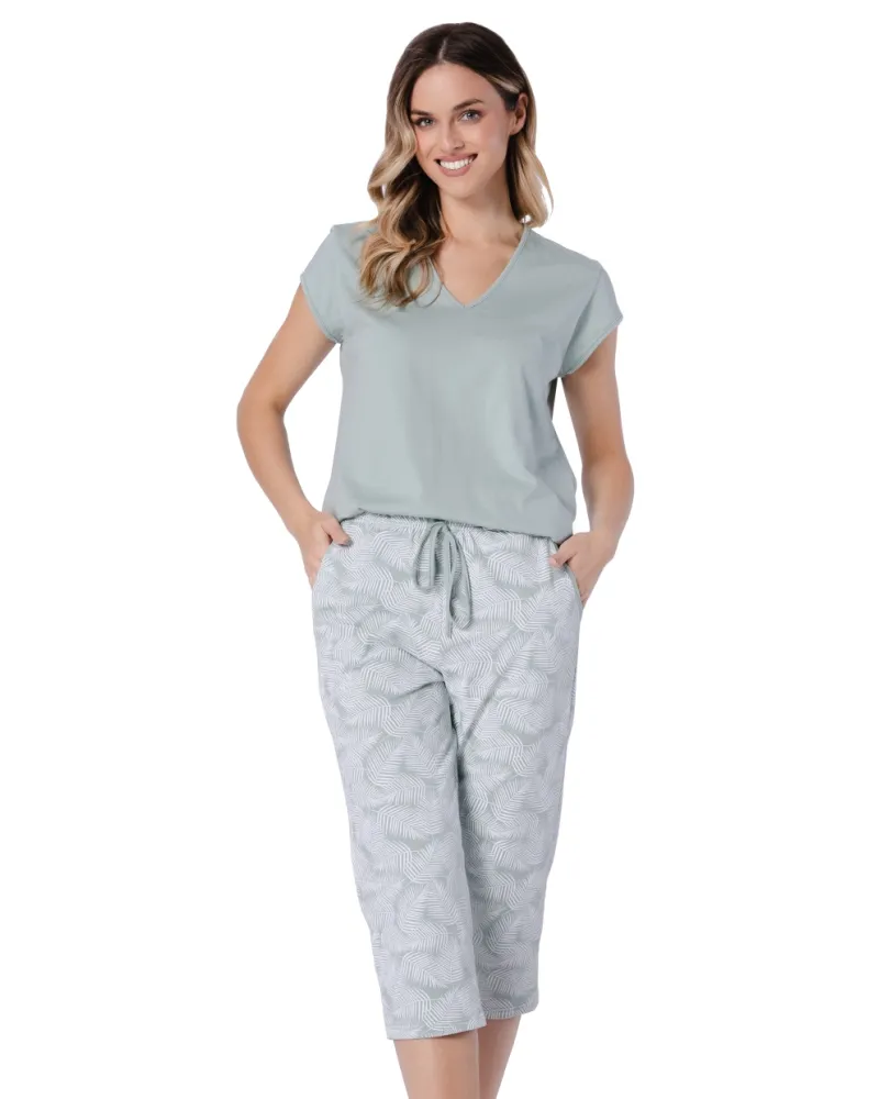 Dámské pyžamo Eleonora 1727 značky LEVEZA je ideální volbou pro ženy, které hledají spojení elegance a pohodlí. Horní díl s krátkým rukávem a véčkovým výstřihem působí jemně a lichotivě, zatímco měkký materiál v decentní zelené barvě přináší pocit svěžesti i během teplých nocí. Spodní část tvoří capri kalhoty, jejichž volný střih s elastickým pasem na šňůrku zaručuje maximální komfort při nošení. Světlý odstín kalhot doplňuje nenápadný vzor, který dodává celému kompletu stylový vzhled bez zbytečné okázalosti.