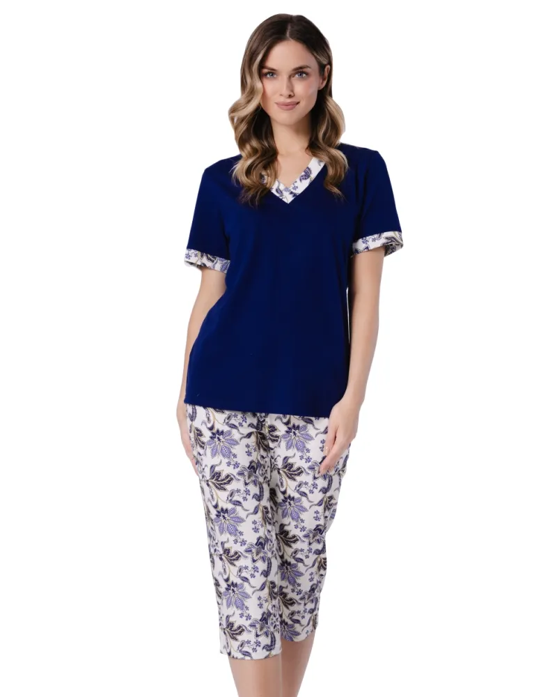 Dámské pyžamo Izabela 1738 značky LEVEZA je dokonalou volbou pro ženy, které si potrpí na pohodlí a vkusný vzhled i během odpočinku. Horní díl s elegantním véčkovým výstřihem v tmavě modré barvě působí decentně, zatímco krátké rukávy s květinovým lemem dodávají jemný ženský akcent. Capri kalhoty se vzorem ladícím k detailům topu vytvářejí harmonický celek a zajišťují maximální komfort při nošení. Lehký materiál ze 100% bavlny příjemně dýchá a poskytuje pocit lehkosti po celou noc i během klidných domácích chvil.