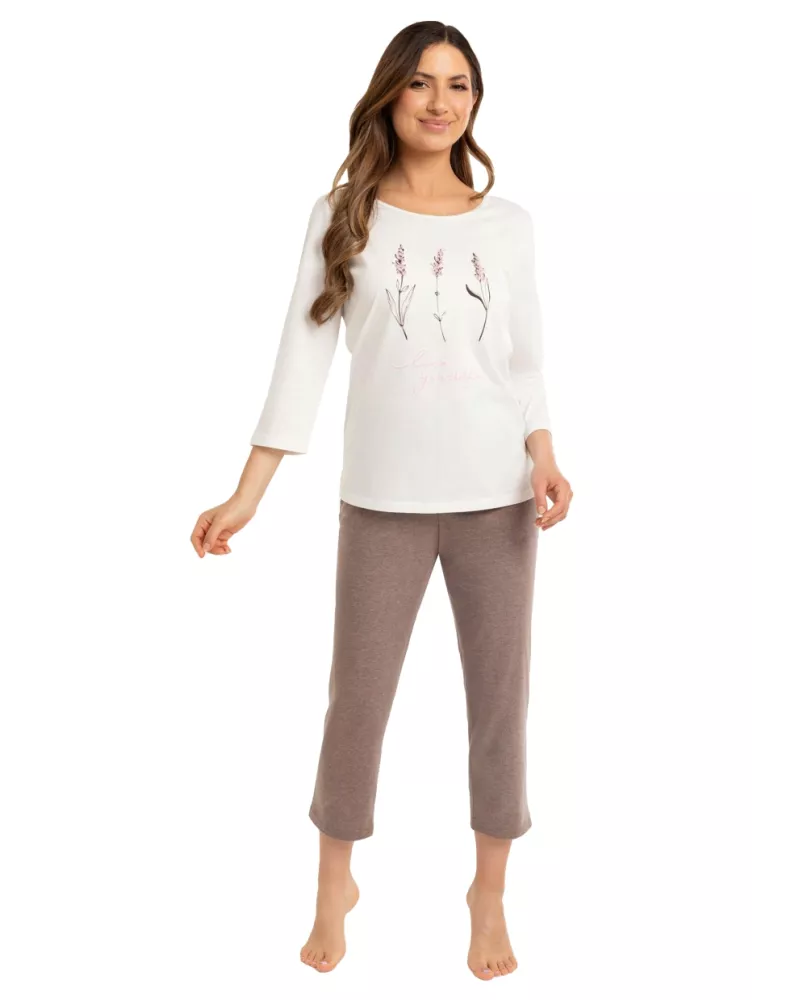 Dámské pyžamo 703/51 značky REGINA představuje dokonalou volbu pro ženy, které hledají spojení elegance a pohodlí. Horní díl v bílé barvě zdobí jemný květinový motiv s decentními odstíny růžové a zelené, který působí svěže a žensky. Kulatý výstřih spolu s tříčtvrtečními rukávy zajišťují příjemné nošení i dostatek volnosti při pohybu. Spodní díl tvoří světle hnědé kalhoty v délce nad kotníky, jejichž uvolněný střih podporuje pocit lehkosti po celý den i noc.