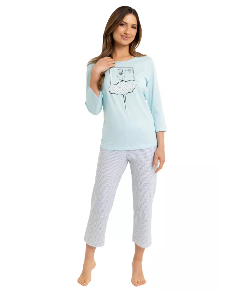 Dámské pyžamo 716/51 značky REGINA přináší do Vašeho domova svěží kombinaci pohodlí a elegance. Horní díl v jemném pastelově modrém odstínu zaujme relaxačním střihem, kulatým výstřihem a tříčtvrtečními rukávy, které oceníte během klidných večerů i víkendových rán. Přední část zdobí hravý obrázek plameňáka, který vnese do každého dne špetku radosti. Spodní díl tvoří dlouhé kalhoty se vzorem jemných proužků, zakončené nad kotníky pro maximální volnost pohybu a příjemný pocit při nošení.
