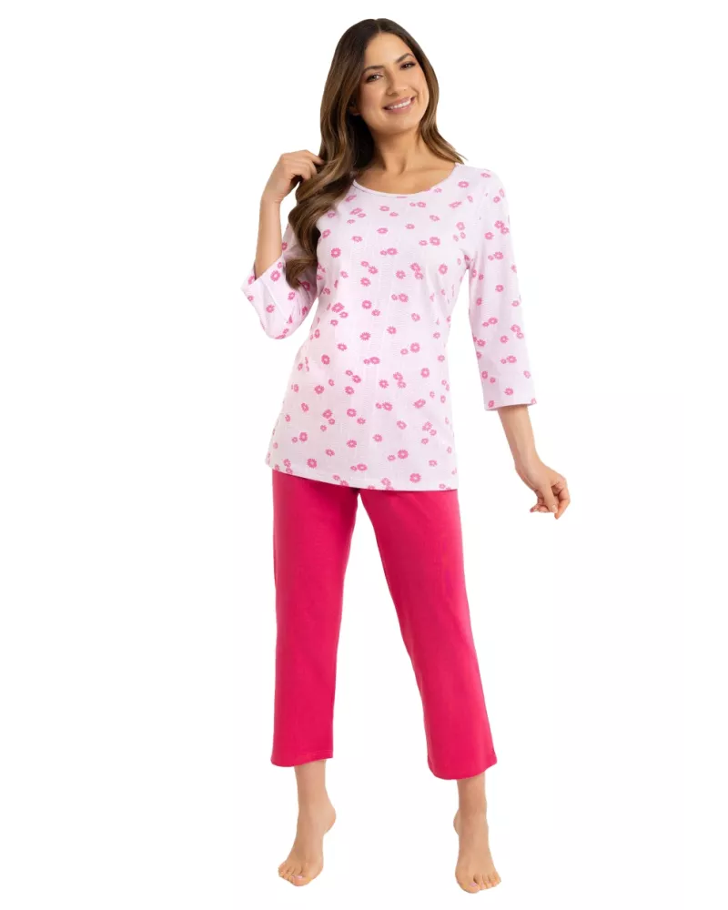 Dámské pyžamo 720/51 značky REGINA přináší dokonalou rovnováhu mezi pohodlím a elegancí pro každou ženu, která si potrpí na kvalitní domácí oblečení. Horní díl s tříčtvrtečními rukávy a kulatým výstřihem vyniká jemným květinovým vzorem na bílém podkladu, zatímco jednobarevné růžové kalhoty v délce ke kotníkům vytvářejí svěží kontrast. Díky měkkému a prodyšnému materiálu si můžete dopřát maximální pohodlí během odpočinku i spánku. Pyžamo je vyrobeno ze 100% bavlny, která zaručuje příjemný pocit na pokožce a dlouhou životnost.
