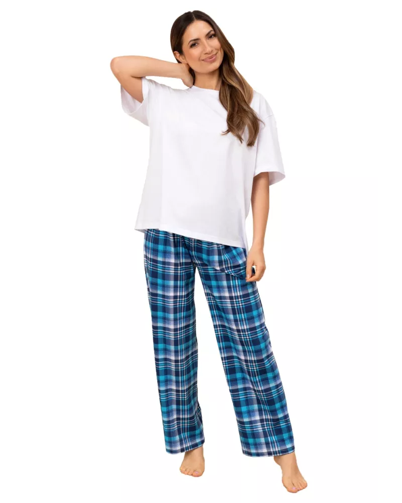Dámské pyžamo 725/51 značky REGINA přináší dokonalou rovnováhu mezi elegancí a pohodlím, které si zamilujete při každém večeru. Horní díl v čistě bílé barvě s krátkým rukávem a kulatým výstřihem nabízí příjemný pocit lehkosti, zatímco volné kalhoty s klasickým modrým kostkovaným vzorem dodávají celku moderní šmrnc. Díky použití 100% bavlny si můžete být jisté měkkostí materiálu, který dýchá a jemně obejme Vaši pokožku. Pyžamo je navrženo tak, aby Vám poskytlo maximální volnost pohybu i během klidného spánku nebo odpočinku doma. Kombinace minimalistického horního dílu a výrazných kalhot vytváří stylový kontrast, jenž podtrhne Váš osobitý vkus.