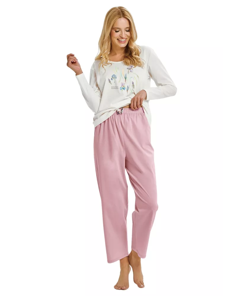 Dámské pyžamo Monica 3459 značky TARO představuje spojení elegance a pohodlí, které si zamilujete při každém večeru doma. Horní díl v krémovém odstínu zdobí jemný květinový motiv, který přináší svěží nádech a ženský šarm. Díky dlouhým rukávům a volnému střihu se budete cítit maximálně uvolněně během odpočinku i spánku. Kalhoty v něžné pastelově růžové barvě mají elastický pas pro snadné oblékání a příjemný pocit po celý den i noc. Měkký materiál ze 100% bavlny je prodyšný, hebký na dotek a vhodný i pro citlivou pokožku.