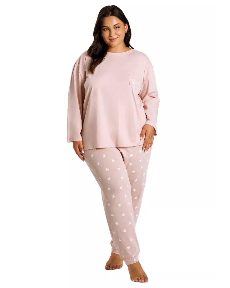 Dámské nadměrné pyžamo Nori 3468 značky TARO přináší spojení elegance a pohodlí, které si zaslouží každá žena. Tento dvoudílný set v jemném pastelově růžovém odstínu je navržen pro chvíle klidu i odpočinku. Vrchní díl s dlouhými rukávy a kulatým výstřihem nabízí uvolněný střih a decentní krajkový detail, který podtrhuje ženskost. Praktická kapsička na hrudi dodává pyžamu ležérní nádech. Spodní díl tvoří dlouhé kalhoty s elastickým pasem a hravým vzorem bílých srdíček, díky kterému se budete cítit příjemně a stylově zároveň. Materiál z čisté bavlny je lehký, prodyšný a šetrný k pokožce – ideální volba pro každodenní nošení doma i na spaní.