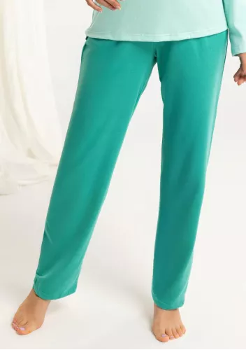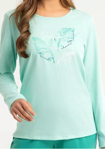 Dámské pyžamo Aja 1652 značky LEVEZA představuje dokonalou kombinaci elegance a pohodlí pro každou ženu, která si potrpí na kvalitní domácí oděv. Vrchní díl v osvěžující tyrkysové barvě s dlouhými rukávy působí svěže a zároveň decentně. Volnější střih zajišťuje maximální komfort při nošení, zatímco kulatý výstřih podtrhuje ženskou siluetu. Spodní díl vyniká výrazným květinovým vzorem v tónech modré, fialové a zelené – tento kontrast dodává celému kompletu hravost i šmrnc.