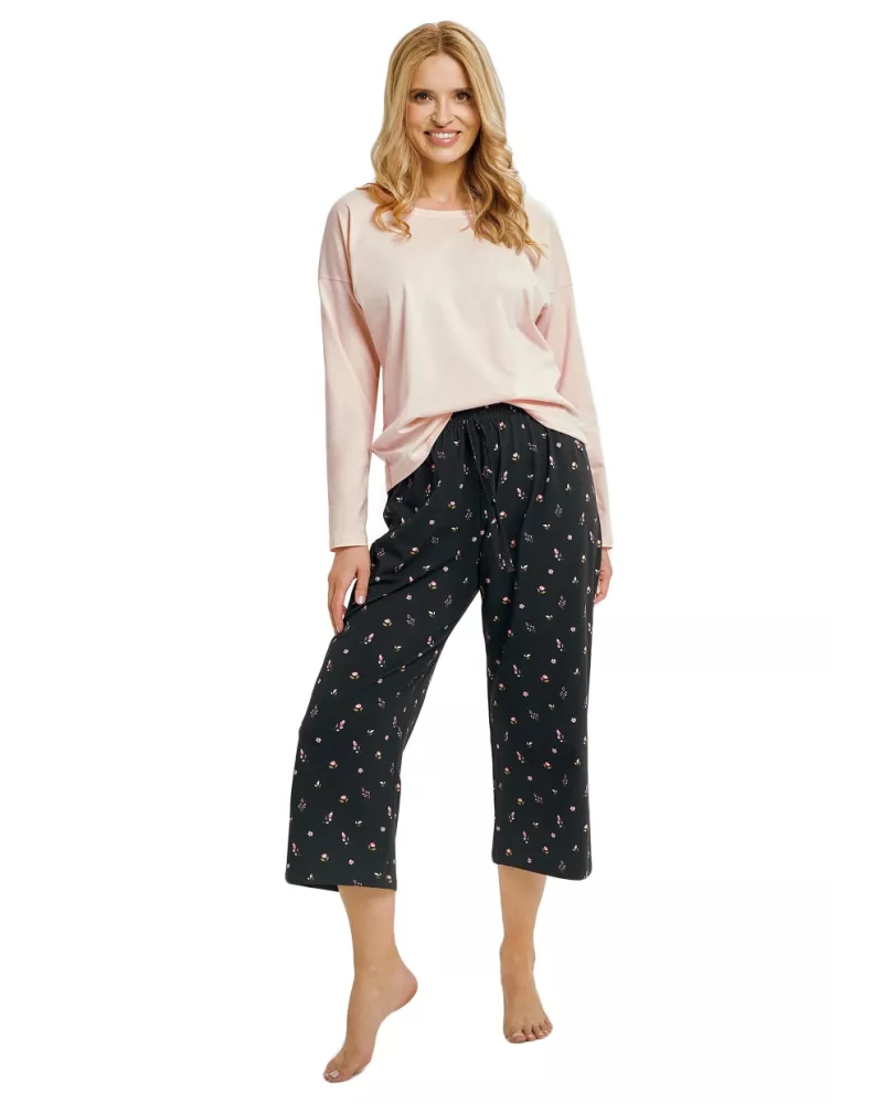 Dámské pyžamo Irene 3457 značky TARO přináší do Vašeho domova harmonii stylu a pohodlí. Horní díl v jemné pastelově růžové barvě zaujme volnějším střihem s dlouhými rukávy a klasickým kulatým výstřihem, který působí elegantně i uvolněně. Lehký, prodyšný materiál ze 100% bavlny Vás zahalí do pocitu lehkosti po celý večer. Spodní díl tvoří černé kalhoty s hravým vzorem, které sahají ke kotníkům a díky elastickému pasu se šňůrkou se dokonale přizpůsobí Vašim potřebám. Pyžamo je ideální volbou pro chvíle odpočinku i klidné noci.