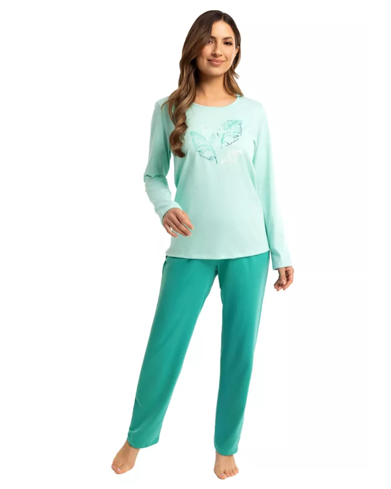Dámské pyžamo 705/51 značky REGINA přináší spojení elegantního vzhledu a pohodlí, které si zamilujete při každém večeru. Vrchní díl v jemné zelené barvě zdobí decentní motýlí motiv, který dodává celku ženský šarm bez zbytečné okázalosti. Kulatý výstřih a dlouhé rukávy vytvářejí příjemný pocit zahalení i během chladnějších nocí. Kalhoty v tmavší mořské barvě mají rovný střih pro maximální volnost pohybu a elastický pas se dokonale přizpůsobuje Vašemu tělu.
