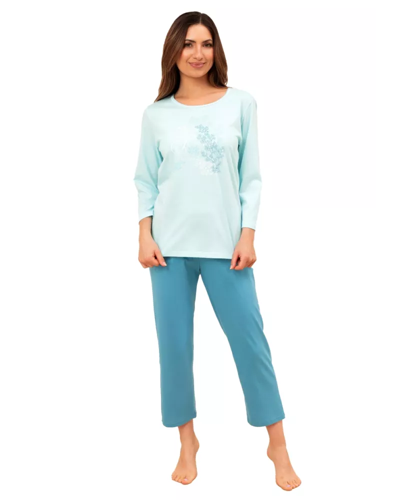 Dámské pyžamo 706/53 značky REGINA přináší harmonii elegance a pohodlí do Vašeho každodenního odpočinku. Horní díl v jemném světle modrém odstínu zdobí decentní květinový motiv, který působí svěže a žensky, aniž by narušoval čistotu designu. Dlouhé rukávy s mírným zúžením u zápěstí chrání před chladem a kulatý výstřih zajistí volnost i příjemný pocit při nošení. Spodní díl v tmavším tónu modré ladně doplňuje celý komplet – rovné nohavice se lehce zužují ke kotníkům, což podporuje volnost pohybu i během spánku.