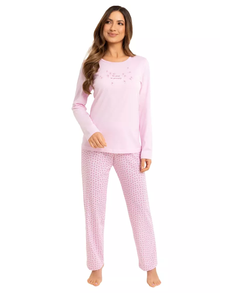 Dámské pyžamo 708/52 značky REGINA přináší do Vašeho večerního rituálu pocit lehkosti a pohodlí. Jemný pastelově růžový odstín v kombinaci s dlouhými rukávy a kulatým výstřihem působí elegantně, zatímco hravé motivy na tričku i kalhotách dodávají celku špetku radosti. Volnější střih horního dílu spolu s rovnými nohavicemi zajišťuje volnost pohybu během spánku i odpočinku doma. Elastický pas kalhot se postará o příjemné nošení bez nepříjemného stahování.
