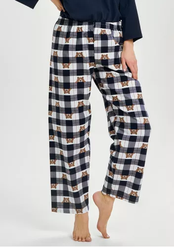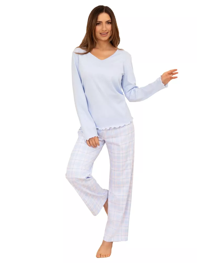 Dámské pyžamo 712/52 značky REGINA přináší elegantní spojení pohodlí a stylu, které ocení každá žena. Horní díl v jemné světle modré barvě s dlouhými rukávy a výstřihem do V působí lehce a vzdušně, zatímco decentní vlnkované zakončení dodává celku ženský nádech. Spodní díl tvoří široké kalhoty s klasickým kostkovaným vzorem ve světlých odstínech modré a bílé, což zajišťuje nejen atraktivní vzhled, ale i maximální volnost pohybu při odpočinku nebo spánku.
