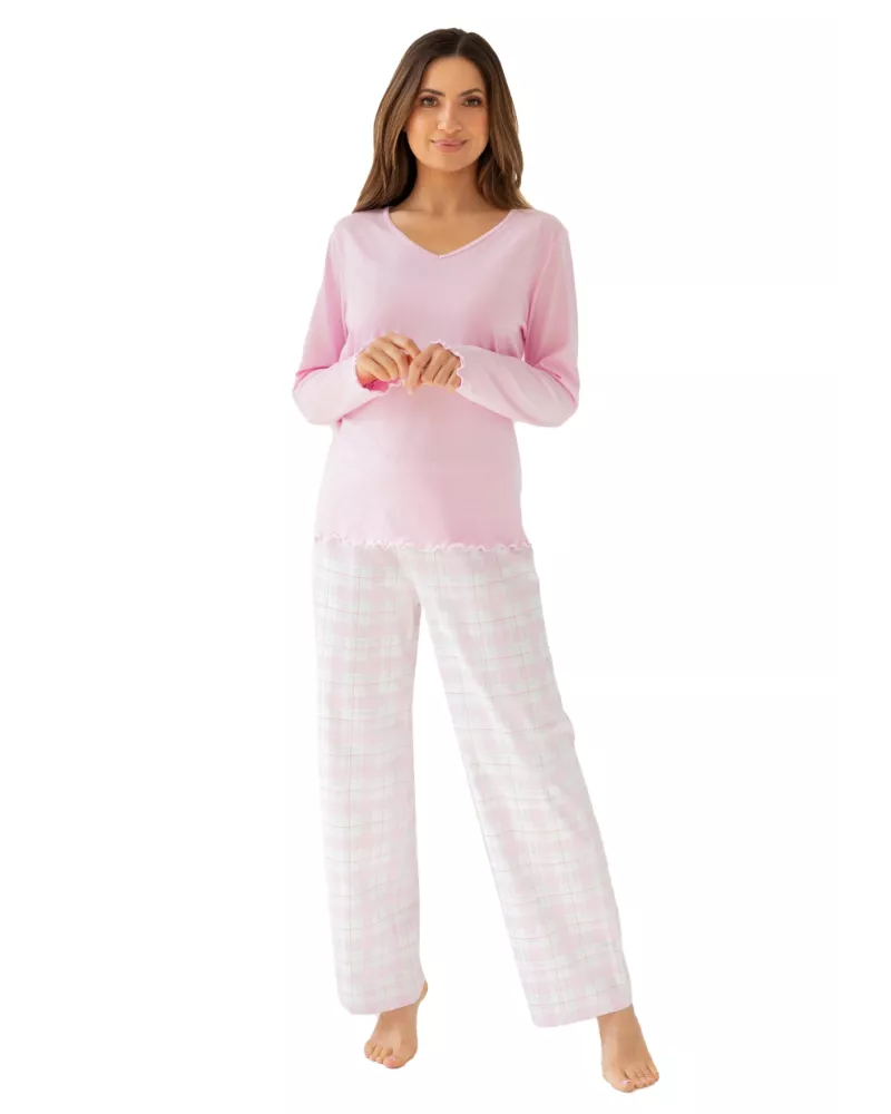 Dámské pyžamo 712/51 značky REGINA představuje dokonalou volbu pro ženy, které hledají spojení elegance a pohodlí v domácím prostředí. Horní díl v jemné růžové barvě s dlouhými rukávy a véčkovým výstřihem působí lehce a žensky, zatímco decentní řasení na lemu dodává celku sofistikovaný nádech. Spodní část tvoří bílé kalhoty s jemným kostkovaným vzorem v pastelových tónech, které jsou volného střihu a díky elastickému pasu zajišťují maximální komfort při nošení i pohybu. Měkký materiál ze 100% bavlny je příjemný na dotek, skvěle dýchá a poskytuje pocit svěžesti po celý den i noc.