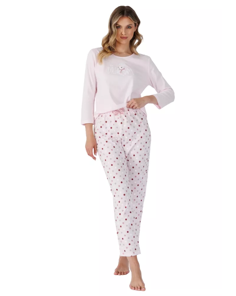 Dámské pyžamo Enea 1495 značky LEVEZA představuje dokonalou volbu pro ženy, které si chtějí dopřát pohodlí a styl během odpočinku. Horní díl v jemné pastelově růžové barvě s dlouhými rukávy a uvolněným střihem Vás zahalí do pocitu lehkosti. Roztomilý obrázek ovečky na přední straně dodává hravý nádech. Spodní díl v bílé barvě je ozdobený veselým potiskem drobných puntíků, což vytváří příjemný kontrast k jednoduchému hornímu dílu.