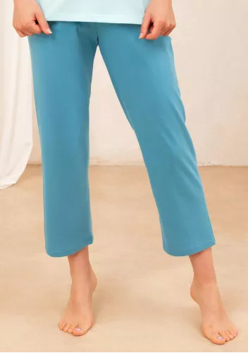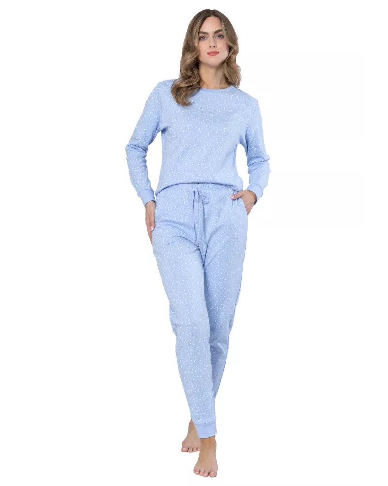 Dámské pyžamo Klarysa 1658 značky LEVEZA je ztělesněním pohodlí a elegance pro každou ženu, která si přeje cítit se příjemně během odpočinku i spánku. Světlý modrý odstín s jemným vzorem bílých teček vytváří decentní vzhled, který působí svěže a vkusně. Dlouhé rukávy a kalhoty s pružným pasem na šňůrku zajistí maximální volnost pohybu i přizpůsobení postavě. Měkká tkanina ze 100% bavlny nabízí výjimečnou prodyšnost, hebkost na dotek a pocit lehkosti po celý den i noc. Kulatý výstřih podtrhuje jednoduchost střihu, zatímco moderní zúžené nohavice zvýrazní ženskou siluetu bez kompromisů v komfortu.