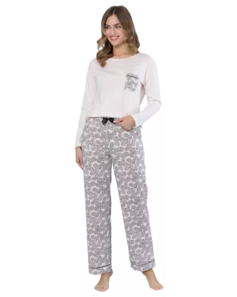 Dámské pyžamo Baska 1698 značky LEVEZA přináší dokonalou rovnováhu mezi elegancí a pohodlím. Horní díl s dlouhými rukávy v jemném světlém odstínu je doplněn dekorativní kapsičkou s kontrastním vzorem, která dodává celku osobitý šarm. Spodní díl se vyznačuje volným střihem a výrazným vzorovaným designem v tmavších tónech na světlém podkladu, což vytváří harmonický celek vhodný pro klidné večery i ničím nerušený spánek. Lehký materiál ze 100% bavlny je příjemný na dotek, prodyšný a ideální pro každodenní domácí nošení.