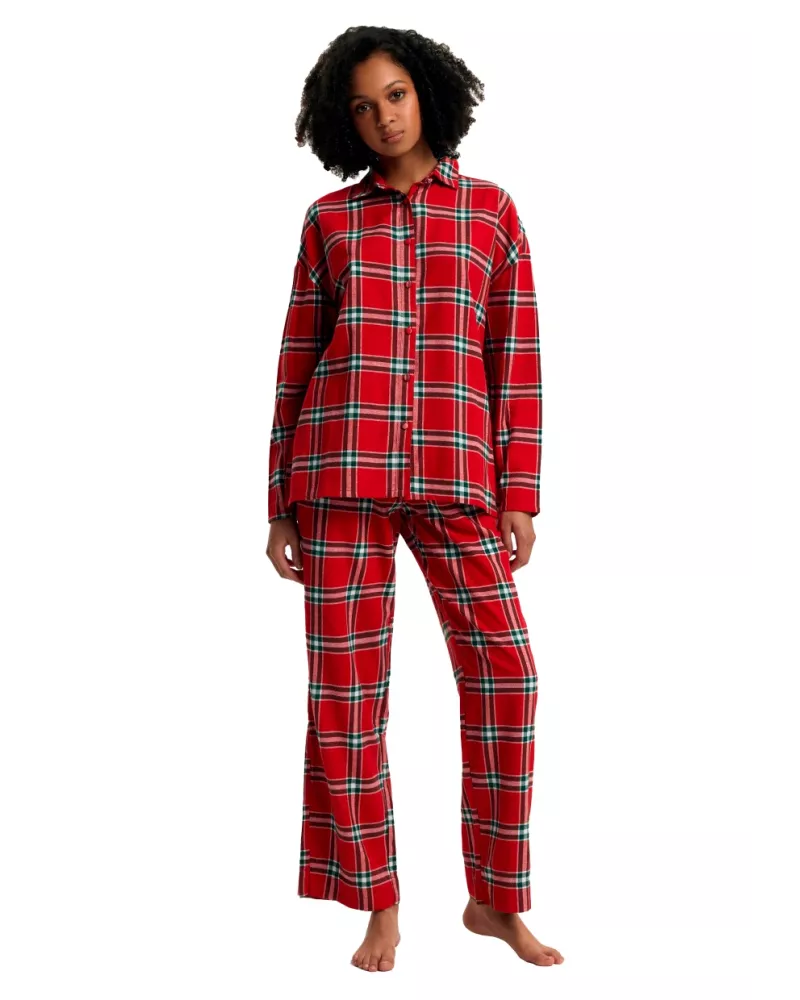 Dámské pyžamo Dalisa 43716 značky HENDERSON představuje spojení klasického stylu a maximálního pohodlí. Tento elegantní komplet v tradičním kostkovaném vzoru sytě červené barvy přináší pocit lehkosti a uvolnění, který oceníte během chladných večerů i klidnějších rán. Košile s dlouhým rukávem má propínací zapínání na knoflíky a límeček, což zajišťuje nejen praktičnost, ale také sofistikovaný vzhled. Kalhoty jsou navrženy se středně vysokým pasem a rovnými nohavicemi pro volnost pohybu i dokonalý komfort při odpočinku.