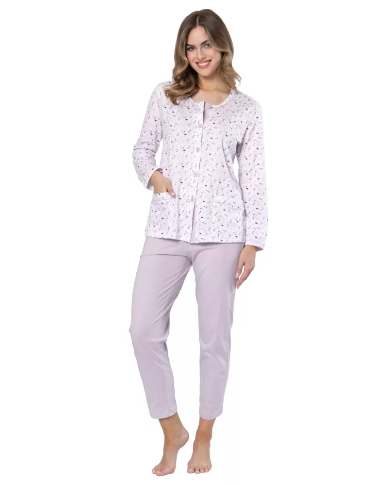 Dámské pyžamo Danuta 1637/1679 značky LEVEZA přináší spojení elegance a pohodlí, které si zamilujete při každém večerním odpočinku. Horní díl s kulatým výstřihem a propínacím zapínáním je zdoben jemným květinovým vzorem na světle levandulovém podkladu, což vytváří příjemně ženský vzhled. Dlouhé rukávy v mírně volném střihu poskytují maximální komfort i volnost pohybu. Praktické kapsy na bocích oceníte pro drobnosti nebo zahřátí rukou během chladnějších večerů.