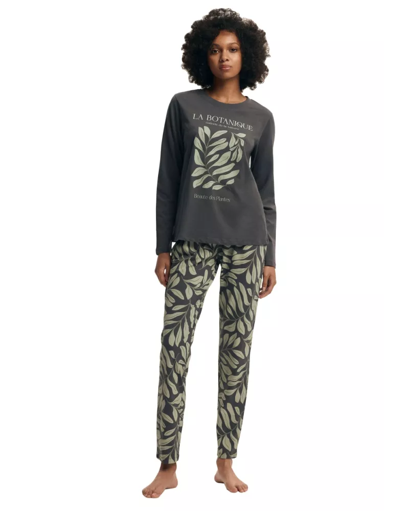 Dámské pyžamo Danna 43685 značky HENDERSON je dokonalou volbou pro ženy, které hledají spojení elegance a pohodlí. Horní díl v tmavě šedé barvě s kulatým výstřihem zdobí botanický motiv listů v zelených a krémových tónech, doplněný nápisem „LA BOTANIQUE“. Kalhoty se vzorem velkých stylizovaných listů na světlém podkladu vytvářejí harmonický celek. Díky měkkému materiálu ze 100% bavlny si můžete užít příjemný pocit lehkosti při každodenním nošení i během spánku. Elastický pas zajišťuje maximální komfort bez omezení pohybu.