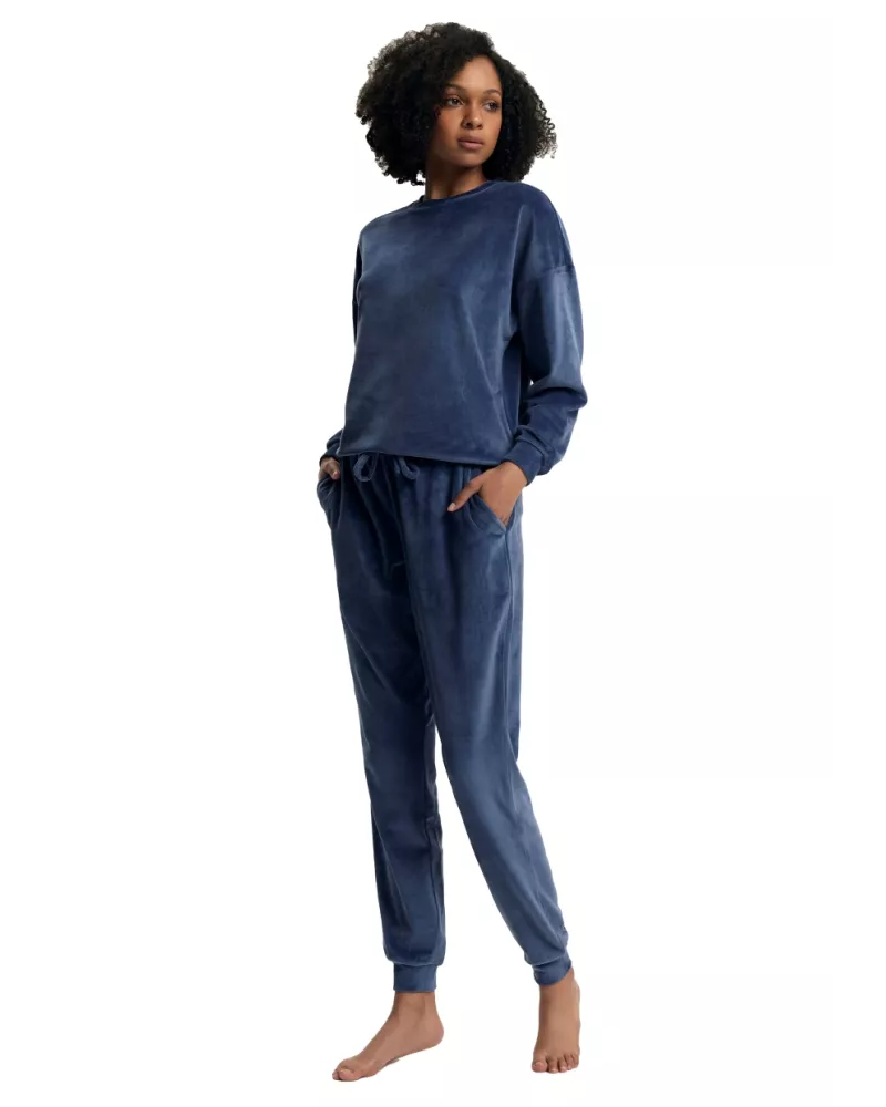 Dámské pyžamo Delanie 43722/59 značky HENDERSON přináší do Vašeho domova eleganci a pohodlí v jednom. Tento set v hlubokém námořnickém odstínu zaujme svým jednoduchým, čistým designem bez vzoru a dokonale se hodí pro chvíle odpočinku i klidné večery. Měkký velur s jemným sametovým povrchem Vás zahalí do pocitu lehkosti, zatímco volnější střih poskytuje maximální komfort při každém pohybu. Kulatý výstřih působí decentně a nadčasově, dlouhé kalhoty s elastickými manžetami zase podtrhují praktičnost celého kompletu.