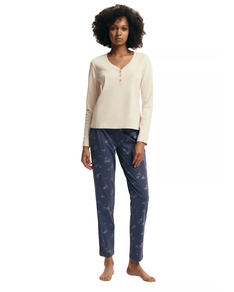 Dámské pyžamo Delanie 43689 značky HENDERSON přináší spojení elegance a pohodlí, které si zamilujete při každém domácím večeru. Vrchní díl v jemném béžovém odstínu s výstřihem do V a decentními knoflíky působí nadčasově a zároveň nenuceně. Dlouhé rukávy chrání před chladem, zatímco příjemný materiál Vás zahalí do pocitu lehkosti. Spodní díl v tmavě modré barvě zdobí jemný květinový vzor, který dodává celku ženský šarm. Rovné nohavice s pružným pasem zajistí maximální komfort po celý den i noc.
