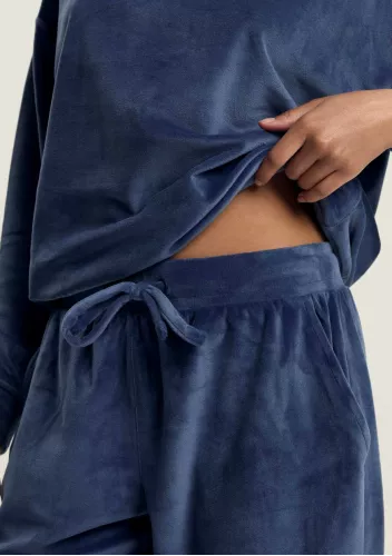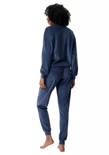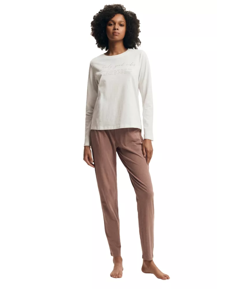 Spodní díl tvoří dlouhé kalhoty v tlumené růžové barvě s elastickým pasem a úzkými manžetami u kotníků – ideální volba pro chvíle odpočinku i klidný spánek. Volnější střih zajišťuje maximální komfort bez omezení pohybu.