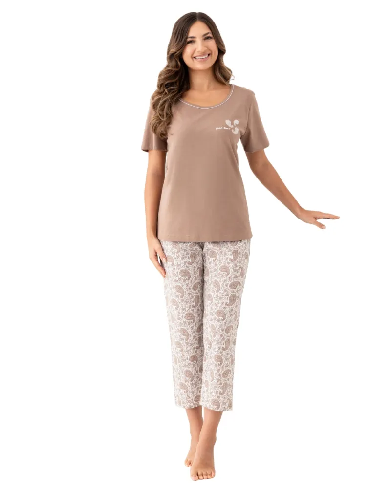 Dámské pyžamo 729/62 značky REGINA přináší dokonalou rovnováhu mezi elegancí a pohodlím. Horní díl v podobě trička s krátkým rukávem je navržený pro volnost pohybu a příjemný pocit na pokožce. Jemná taupe barva působí klidně, zatímco decentní obrázek na hrudi dodává celku osobitost bez zbytečné okázalosti. Kulatý výstřih podtrhuje ženskost a zajišťuje maximální komfort při nošení.