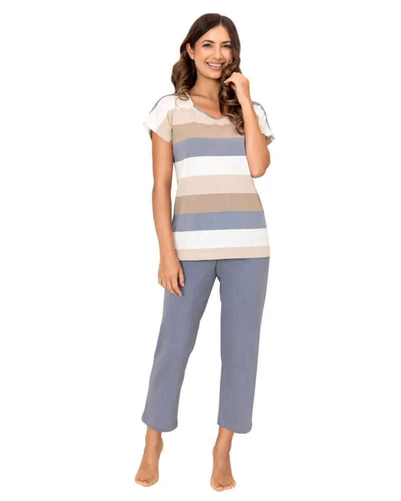 Dámské pyžamo 741/63 značky REGINA přináší spojení elegance a pohodlí, které oceníte při každém večeru i poklidném ránu. Horní díl s kulatým výstřihem a krátkými rukávy nabízí vzdušný střih, jenž zajišťuje volnost pohybu i příjemné nošení po celý rok. Jemné vodorovné proužky v odstínech krémové, světle hnědé, taupe a šedé vytvářejí decentní vzhled vhodný pro každou ženu hledající stylovou domácí pohodu. Dlouhé kalhoty v jednobarevné šedé ladí s horním dílem a díky elastickému pasu perfektně sednou bez pocitu stažení.