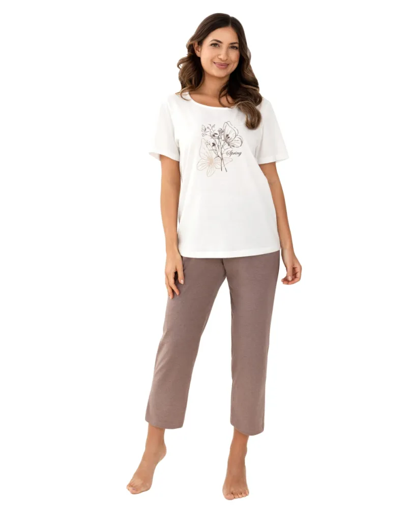 Dámské pyžamo 739/62 značky REGINA představuje spojení elegance a pohodlí, které ocení každá žena toužící po kvalitním odpočinku. Horní díl v bílé barvě zdobí jemný květinový motiv, jenž dodává celku sofistikovaný vzhled. Díky volnému střihu s kulatým výstřihem a krátkými rukávy si užijete maximální komfort při každém pohybu. Spodní díl v decentním hnědém odstínu je navržen jako dlouhé kalhoty se střihem pro pocit lehkosti i během klidných domácích večerů.