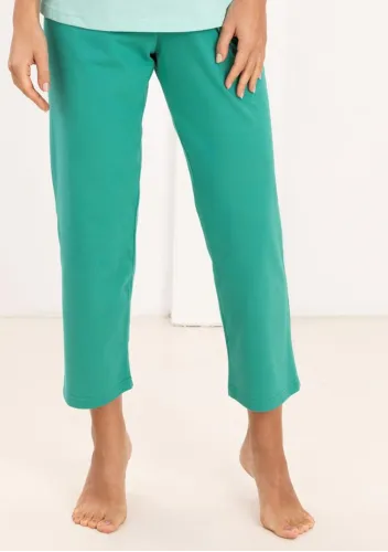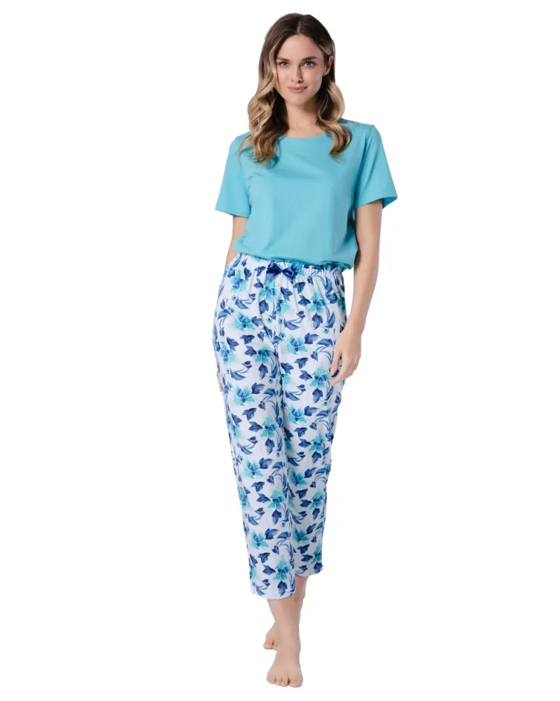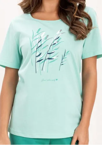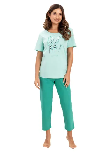 Dámské pyžamo Jana 1741 značky LEVEZA představuje spojení pohodlí a elegance, které ocení každá žena při odpočinku i spánku. Horní díl v osvěžující tyrkysové barvě s krátkým rukávem a kulatým výstřihem působí lehce a vzdušně, zatímco volný střih zajišťuje maximální komfort po celý den. Spodní díl je zdobený jemným květinovým vzorem v modrých a zelených tónech na bílém podkladu, což dodává celému setu sofistikovaný vzhled. Elastický pas kalhot se přizpůsobí Vaší postavě bez omezení pohybu. Materiál ze 100% bavlny je příjemný na dotek, prodyšný a vhodný i pro citlivou pokožku.