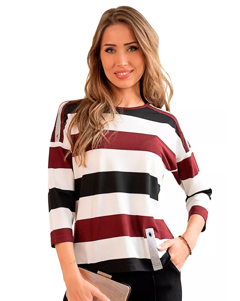 Dámská halenka 1068/29 značky HAJDAN představuje elegantní spojení pohodlí a stylu, které si zamilujete na první dotek. Výrazné vodorovné pruhy v odstínech burgundy, černé a ecri vytvářejí moderní vzhled, který oživí každý Váš outfit. Volnější střih s 3/4 rukávem a kulatým výstřihem přináší pocit lehkosti i během celého dne. Měkký materiál s vysokým podílem viskózy je příjemný k pokožce, prodyšný a jemně pružný díky lycře.
