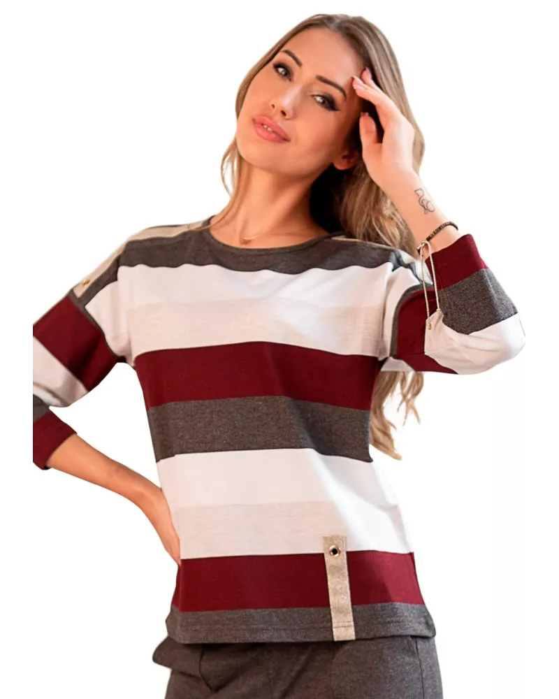 Dámská halenka 1068/36 značky HAJDAN představuje elegantní volbu pro ženy, které hledají spojení stylu a pohodlí. Její výrazný pruhovaný design v odstínech vínové, šedé a bílé dodává outfitu svěžest i originalitu. Lehký materiál s převahou viskózy zajišťuje příjemný pocit na těle po celý den, zatímco 3/4 rukáv a uvolněný střih přinášejí pocit lehkosti i při každodenním nošení. Kulatý výstřih podtrhuje ženskost tohoto kousku a mírně rozšířené manžety rukávů dotvářejí ležérní vzhled.