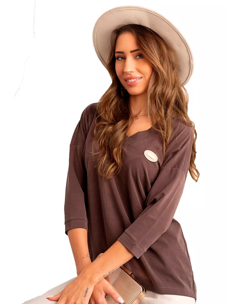 Dámská halenka 1238_05 značky HAJDAN představuje elegantní volbu pro ženy, které hledají spojení pohodlí a stylu. Tento model v hnědém odstínu s výstřihem do V jemně prodlužuje linii krku a působí velmi žensky. Tříčtvrteční rukávy poskytují příjemné zakrytí i vzdušnost, takže se budete cítit lehce po celý den. Materiálová směs je měkká na dotek, pružná a zajišťuje komfort při každém pohybu.