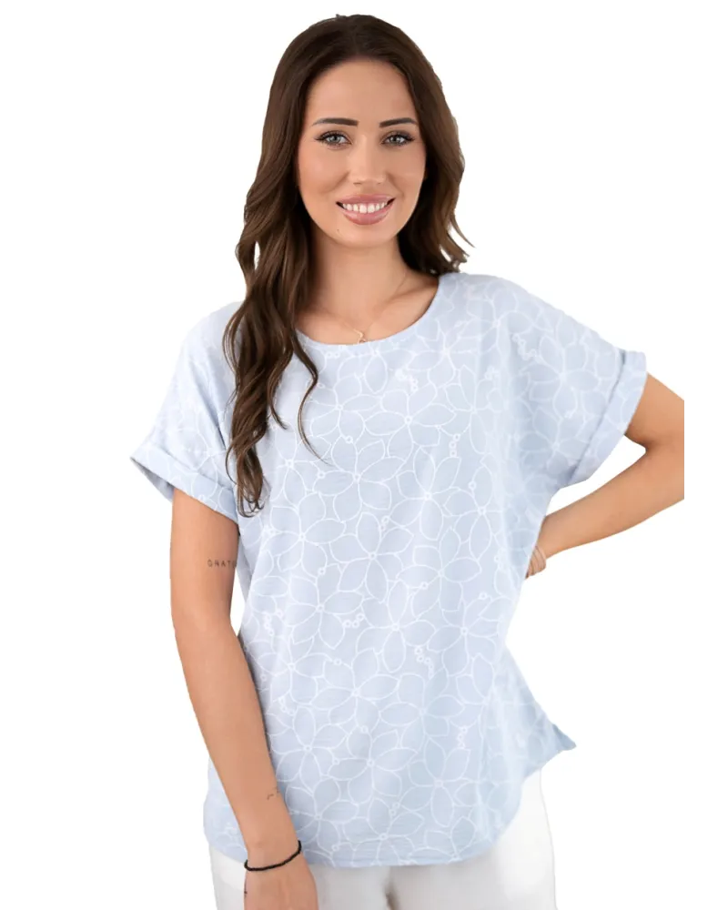 Dámská halenka 1231_06 značky HAJDAN představuje dokonalou volbu pro ženy, které hledají spojení elegance a pohodlí. Světlý modrý odstín s jemným vzorováním působí svěže a decentně, zatímco volný střih zajišťuje maximální komfort po celý den. Krátké rukávy s lehce ohrnutými lemy dodávají modelu uvolněný vzhled, který oceníte při každodenním nošení i během víkendových setkání. Kulatý výstřih lichotí postavě a umožňuje snadné kombinování s oblíbenými doplňky či šperky.