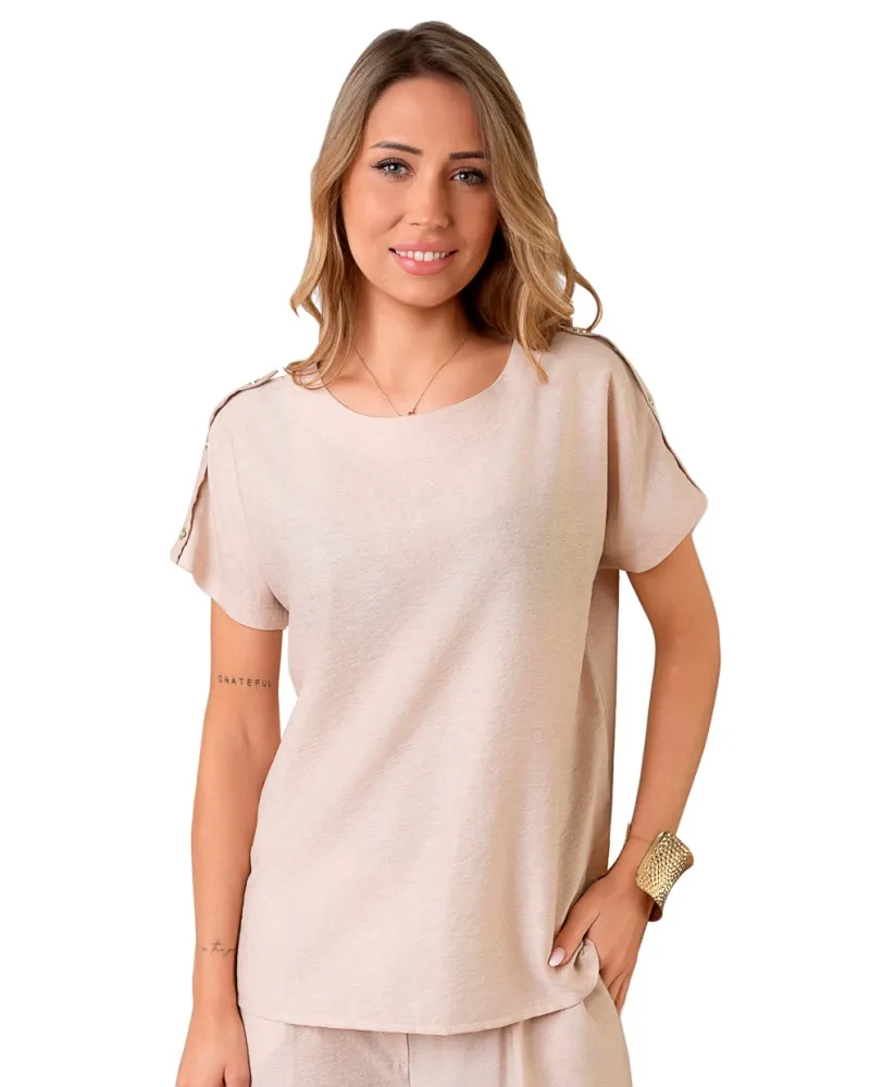 Dámská halenka 1259_01 značky HAJDAN představuje dokonalou kombinaci elegance a pohodlí pro každodenní nošení. Její střih s volnými krátkými rukávy a decentními knoflíky na ramenou vytváří vzdušný dojem, který oceníte při jakékoliv příležitosti. Jemná béžová barva působí velmi univerzálně, snadno ji sladíte s oblíbenými kalhotami i sukněmi.