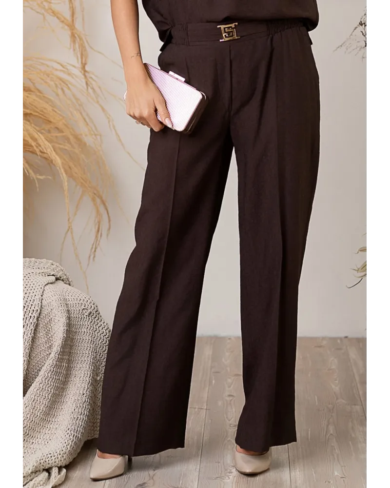 Dámské kalhoty SP013_02 značky HAJDAN představují spojení moderní elegance a pohodlí, které ocení každá žena hledající stylový základ šatníku. Tmavě hnědý odstín působí sofistikovaně a snadno jej sladíte s oblíbenými kousky. Vysoký pas s integrovaným páskem a ozdobnou kovovou přezkou krásně zvýrazní siluetu, zatímco rovný široký střih zajistí volnost pohybu i pocit lehkosti po celý den. Lehký materiál je příjemný na dotek, prodyšný a díky jemnému lesku působí luxusním dojmem – ideální jak do kanceláře, tak na volné chvíle.