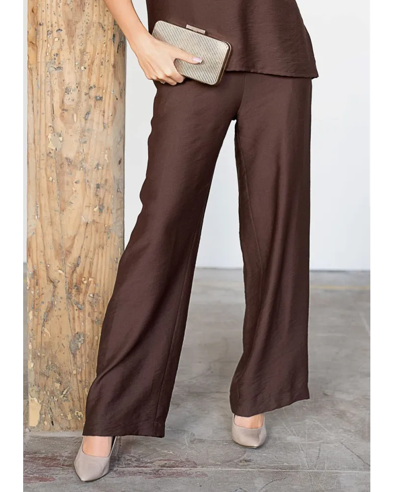 Dámské kalhoty SP011_06 značky HAJDAN představují elegantní řešení pro ženy, které hledají pohodlí a styl v jednom. Hluboký hnědý odstín těchto kalhot působí sofistikovaně a snadno se kombinuje s různými kousky Vašeho šatníku. Široký střih nohavic zajišťuje volnost pohybu i vzdušnost, zatímco elastický pas přináší maximální komfort během celého dne.