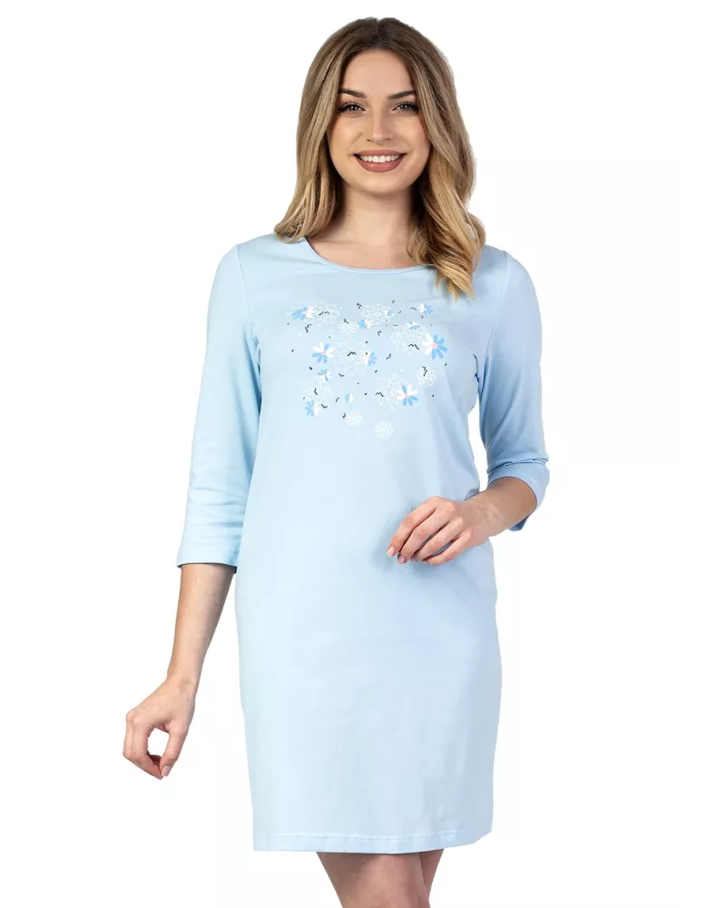 Dámská noční košile 138/41 značky REGINA přináší do Vašeho šatníku lehkost a pohodlí, které si zamilujete. Jemný pastelově modrý odstín působí svěže a decentně, zatímco dekorativní květinový potisk na předním díle dodává celkovému vzhledu jemnou ženskost. Volnější střih s 3/4 rukávy poskytuje maximální komfort i volnost pohybu – ideální pro klidné večery nebo víkendové ráno doma.