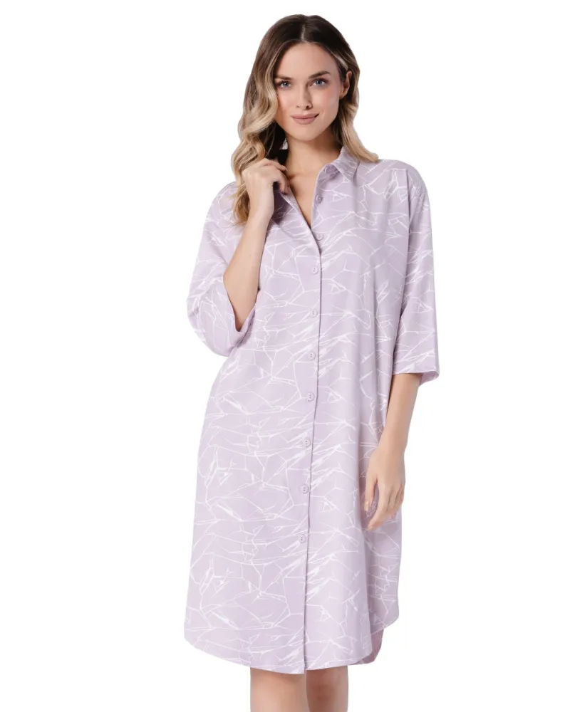 Dámská noční košile Žaklina 1707 značky LEVEZA přináší do Vašeho večerního rituálu spojení elegance a pohodlí. Jemný levandulový odstín s decentním abstraktním vzorem působí svěže a klidně, zatímco klasický límeček dodává modelu sofistikovaný nádech. Lehký, prodyšný materiál z čisté bavlny je příjemný na dotek a zajišťuje maximální komfort po celou noc i během domácí pohody. Volnější střih v délce ke kolenům poskytuje volnost pohybu, tříčtvrteční rukávy vyvažují pocit lehkosti s dostatečným zakrytím. Praktické propínání na knoflíky usnadňuje oblékání i svlékání – ideální pro chvíle relaxace nebo jako stylové domácí oblečení.