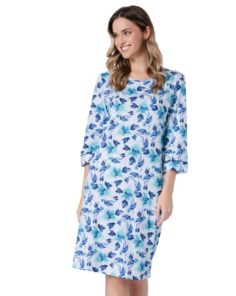 Dámská noční košile Julita 1742 značky LEVEZA je ideální volbou pro ženy, které si potrpí na pohodlí a vkusný vzhled i během odpočinku. Volnější střih s délkou ke kolenům zajišťuje maximální komfort a svobodu pohybu po celou noc. Jemný květinový vzor v odstínech modré a zelené na bílém podkladu působí svěže, zatímco kulatý výstřih přidává decentní eleganci. Lehký materiál ze 100% bavlny je příjemně měkký k pokožce, skvěle dýchá a navozuje pocit lehkosti při každém doteku.