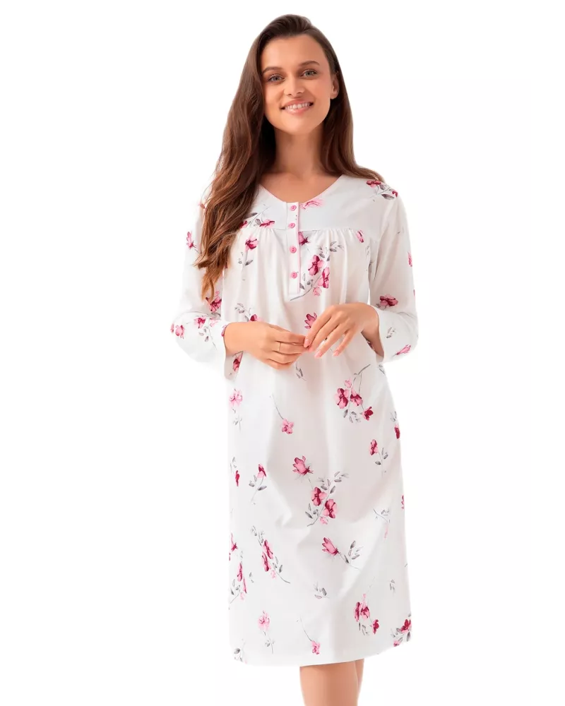 Dámská noční košile 338/51 značky LUNA přináší spojení pohodlí a elegance do Vašeho večerního rituálu. Její vzdušný střih s délkou ke kolenům a dlouhými rukávy zajišťuje volnost pohybu i příjemné nošení po celý rok. Kulatý výstřih s jemným knoflíkovým zapínáním působí decentně, zatímco květinový vzor v růžových tónech dodává ženskost každému detailu. Materiál z jemné bavlny je hebký na dotek, prodyšný a vhodný i pro citlivou pokožku – ideální volba pro klidné noci i pohodové domácí chvíle.