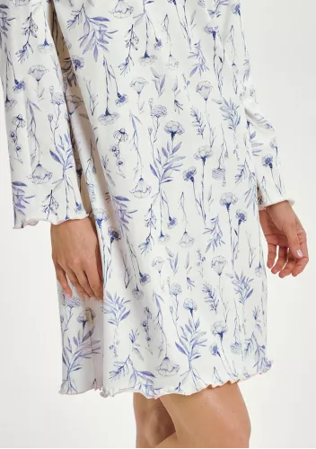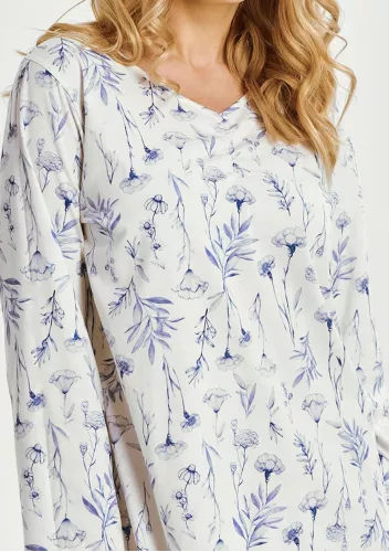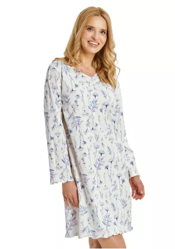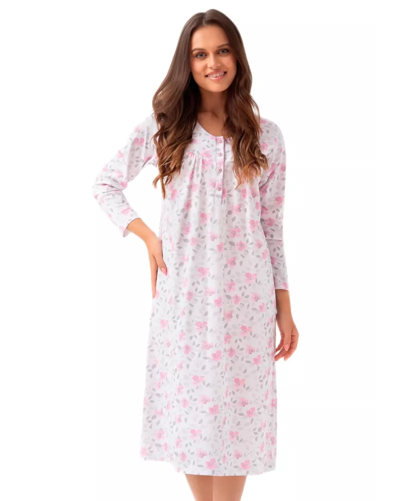 Dámská noční košile 338/52 značky LUNA přináší pocit lehkosti a pohodlí do každého večera. Její jemný květinový vzor v pastelových tónech působí elegantně a dodává domovu příjemnou atmosféru. Volnější střih spolu s dlouhými rukávy zajišťuje maximální komfort při spánku i domácím odpočinku. Kulatý výstřih s knoflíky usnadňuje oblékání a podtrhuje klasický styl, zatímco kvalitní bavlněný materiál je šetrný k pokožce, prodyšný a měkký na dotek. Díky délce ke kolenům se budete cítit uvolněně po celou noc.