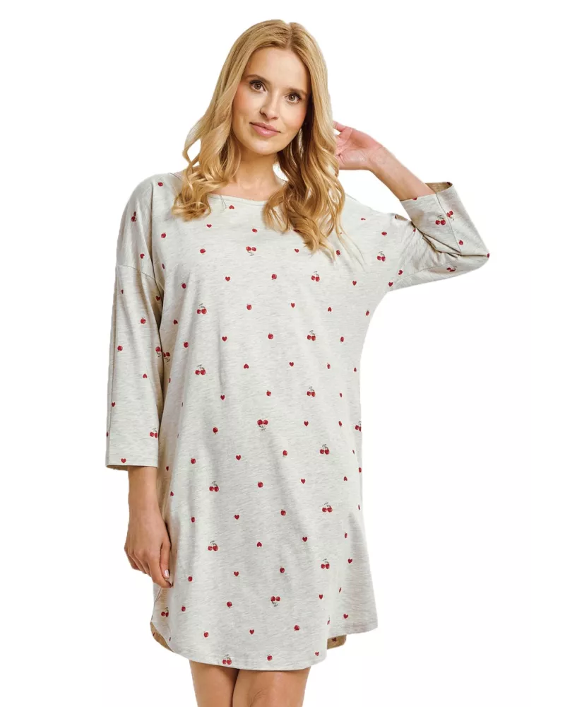 Dámská noční košile Adele 3431 značky TARO přináší spojení pohodlí a elegantního stylu pro Váš večerní odpočinek. Tento model zaujme volným střihem, který jemně splývá s postavou a umožňuje volnost pohybu po celou noc. Kulatý výstřih spolu s dlouhými rukávy vytváří příjemný pocit lehkosti, zatímco hravý potisk drobných třešní dodává šatům svěží, ženský nádech. Na dotek hebký materiál je převážně bavlněný, což znamená vysokou prodyšnost i měkkost při každém nošení.