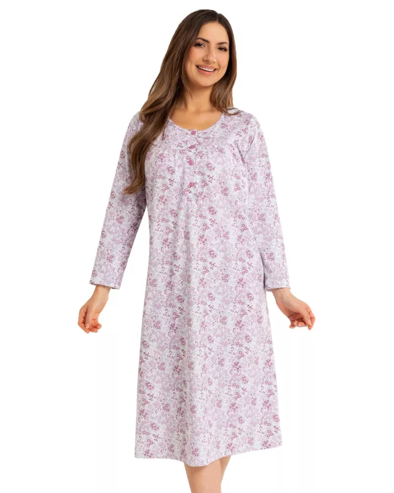 Dámská noční košile 017/51 značky REGINA přináší spojení elegance a pohodlí, které oceníte při každém večeru. Jemný květinový vzor na světlém podkladu vytváří příjemnou atmosféru pro klidné chvíle doma. Volnější střih a dlouhý rukáv zajišťují maximální komfort i během chladnějších nocí, zatímco kulatý výstřih s decentními knoflíky dodává modelu šmrnc i praktičnost. Díky použití 100% bavlny je materiál nejen hebký na dotek, ale také skvěle prodyšný a vhodný pro citlivou pokožku.
