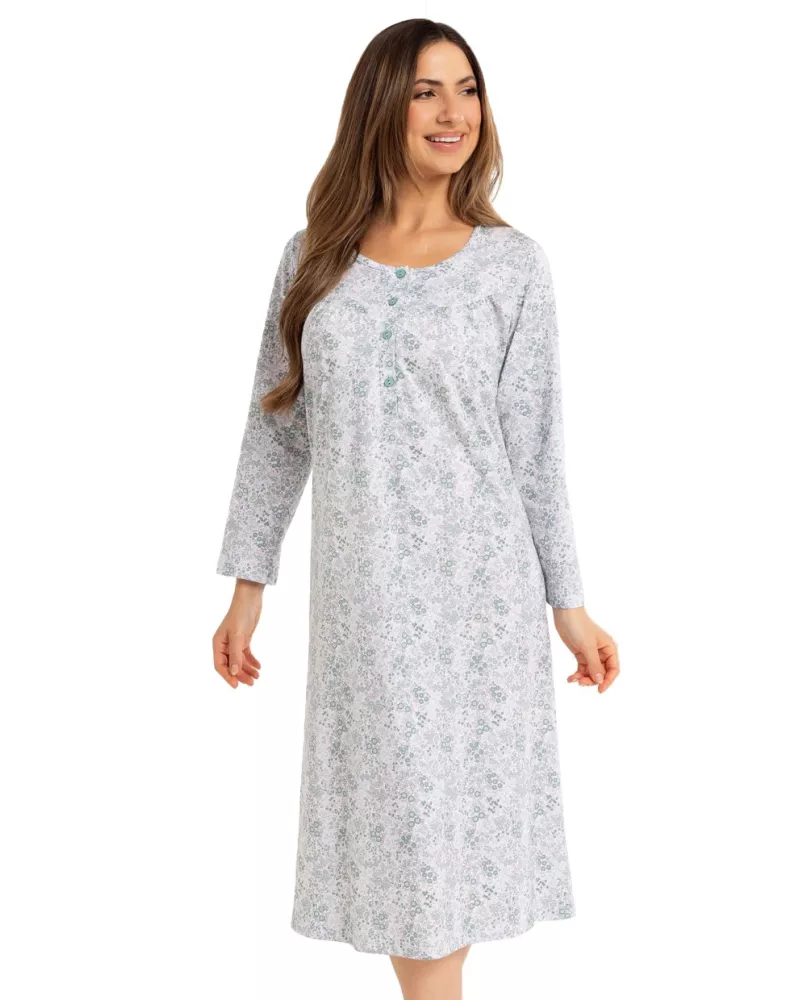 Dámská noční košile 017/53 značky REGINA představuje spojení elegance a pohodlí, které oceníte každý večer. Její klasický střih zajišťuje maximální komfort při spánku i domácí odpočinku. Kulatý výstřih doplňuje decentní knoflíková léga se třemi knoflíky, která dodává jemný nádech tradičního stylu. Jemný květinový vzor v tlumených tónech na světle šedém podkladu působí žensky a přitom nenápadně zdobí celý model.