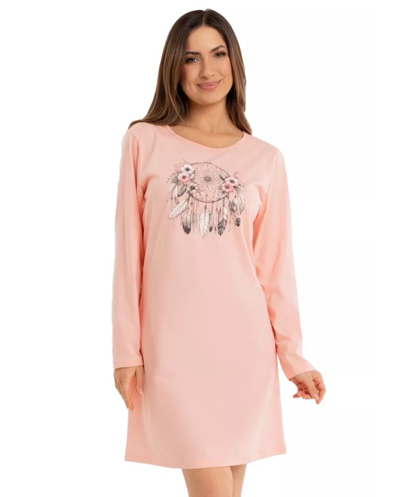 Dámská noční košile 162/53 značky REGINA představuje spojení pohodlí a elegantního stylu, který ocení každá žena. Jemný odstín působí svěže a dodává pocit lehkosti při každém dotyku s pokožkou. Volnější střih s dlouhými rukávy vytváří ideální podmínky pro ničím nerušený spánek i chvíle domácí pohody. Výrazným prvkem je originální grafický potisk na hrudi – motiv lapače snů s květinovými detaily přináší do Vašeho šatníku nádech kreativity.