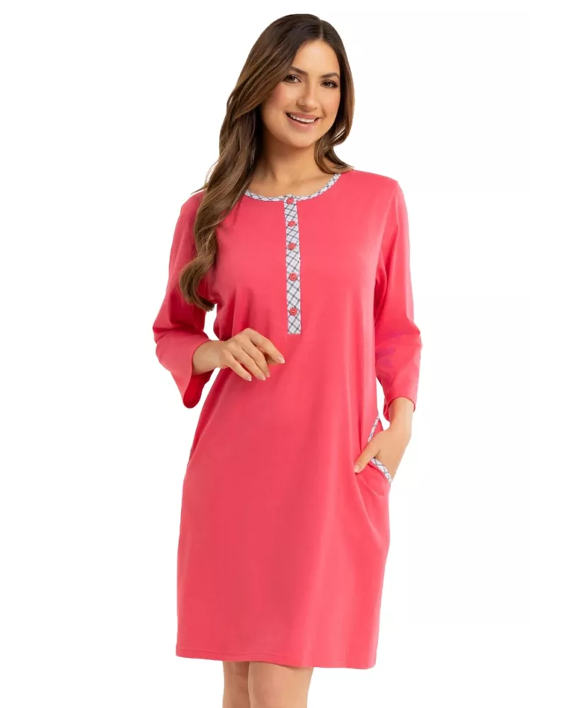 Dámská noční košile 165/51 značky REGINA přináší radost z pohodlí i stylu do každého večera. Zářivý korálově růžový odstín rozzáří Váš domov a jemný vzor na knoflíkové légě dodává šatům osobitý charakter. Volnější střih s kulatým výstřihem a dlouhými rukávy poskytuje maximální volnost pohybu, zatímco praktické kapsy oceníte při domácím lenošení i klidném spánku. Materiál ze 100% bavlny je příjemně měkký, prodyšný a šetrný k pokožce – ideální volba pro každodenní nošení.