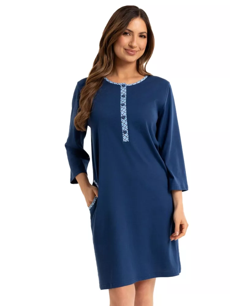 Dámská noční košile 165/52 značky REGINA přináší spojení elegance a pohodlí, které oceníte při každém večeru. Hluboký námořnický odstín působí sofistikovaně, zatímco jemný materiál zaručuje příjemný pocit na pokožce. Volnější střih s dlouhými rukávy poskytuje volnost pohybu i potřebnou vzdušnost pro klidné noci. Kulatý výstřih s kontrastním lemem a decentní knoflíkovou légou dodává modelu osobitost.