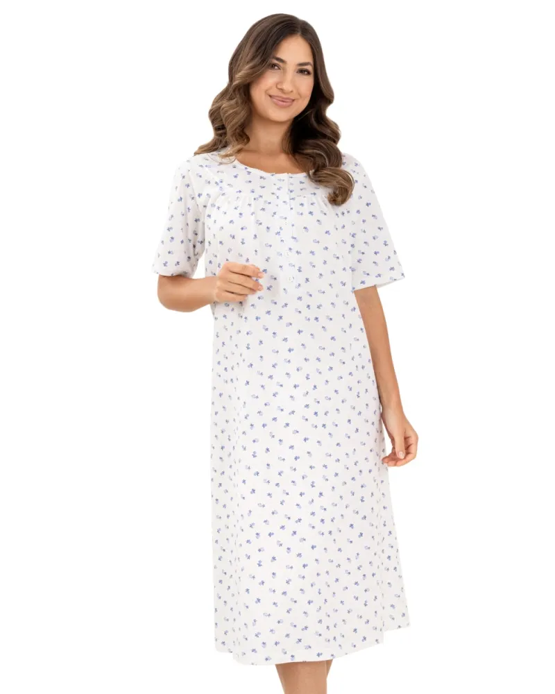 Dámská noční košile 019/62 značky REGINA přináší do Vašeho večerního rituálu pocit lehkosti a svěžesti. Jemný bílý podklad zdobí decentní květinový vzor v modrých tónech, který působí elegantně a navozuje klidnou atmosféru. Volnější střih s krátkým rukávem zajišťuje maximální pohodlí i volnost pohybu během spánku nebo domácího odpočinku. Kulatý výstřih doplňují praktické knoflíky, které usnadňují oblékání a zároveň vytvářejí jemný detail na jinak jednoduchém designu.